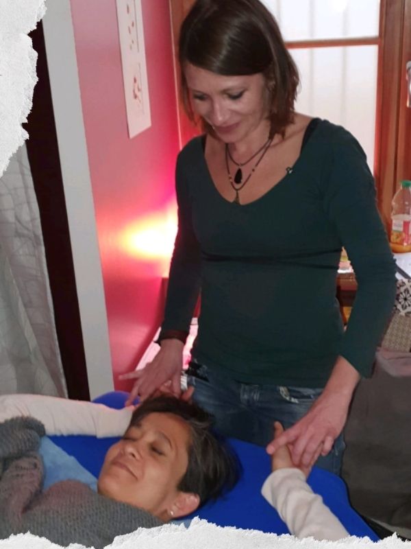 La personne qui reçoit est allongée, généralement sur une table de massage, habillée, bien au chaud sous une couverture.