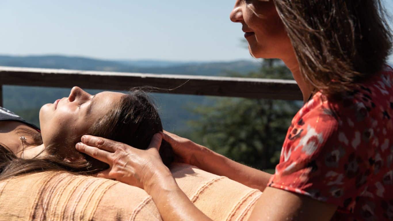 La personne qui reçoit est allongée, généralement sur une table de massage, habillée, bien au chaud sous une couverture.